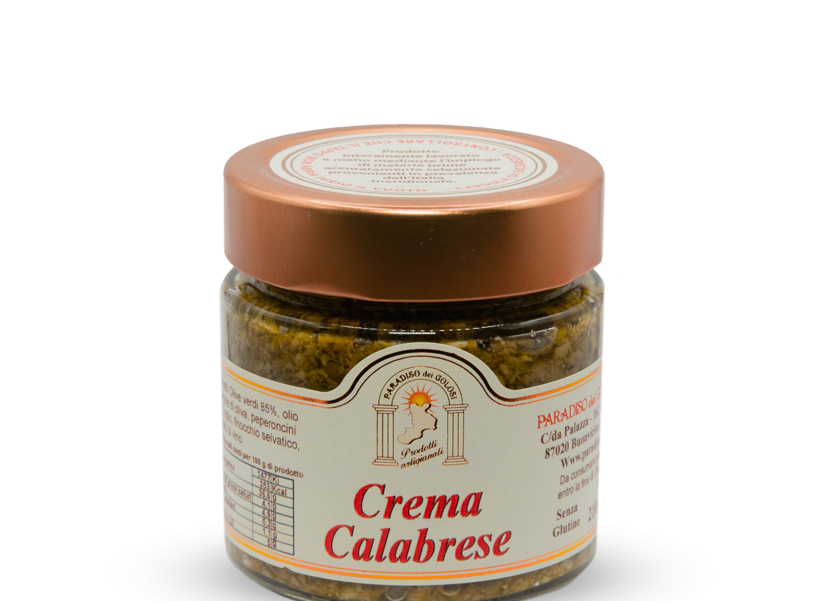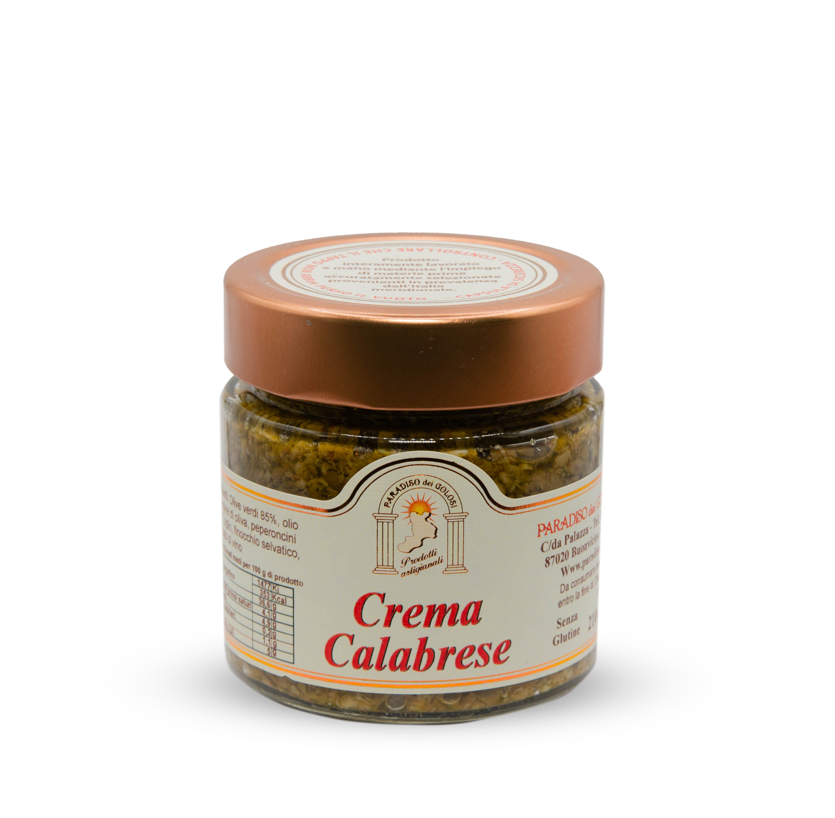 Crema Calabrese 200g Paradiso dei Golosi, czyli krem kalabryjski, to tradycyjna włoska pasta inspirowana kuchnią Kalabrii — regionu słynącego z intensywnych, wyrazistych smaków. Produkt powstaje na bazie zielonych oliwek (85%), które nadają mu głębię i naturalną kremowość. Kompozycję uzupełnia oliwa extra vergine z oliwek, ostre papryczki chili, czosnek, dziki koper włoski (finocchio selvatico), sól oraz ocet winny, które razem tworzą harmonijną, lekko pikantną całość.