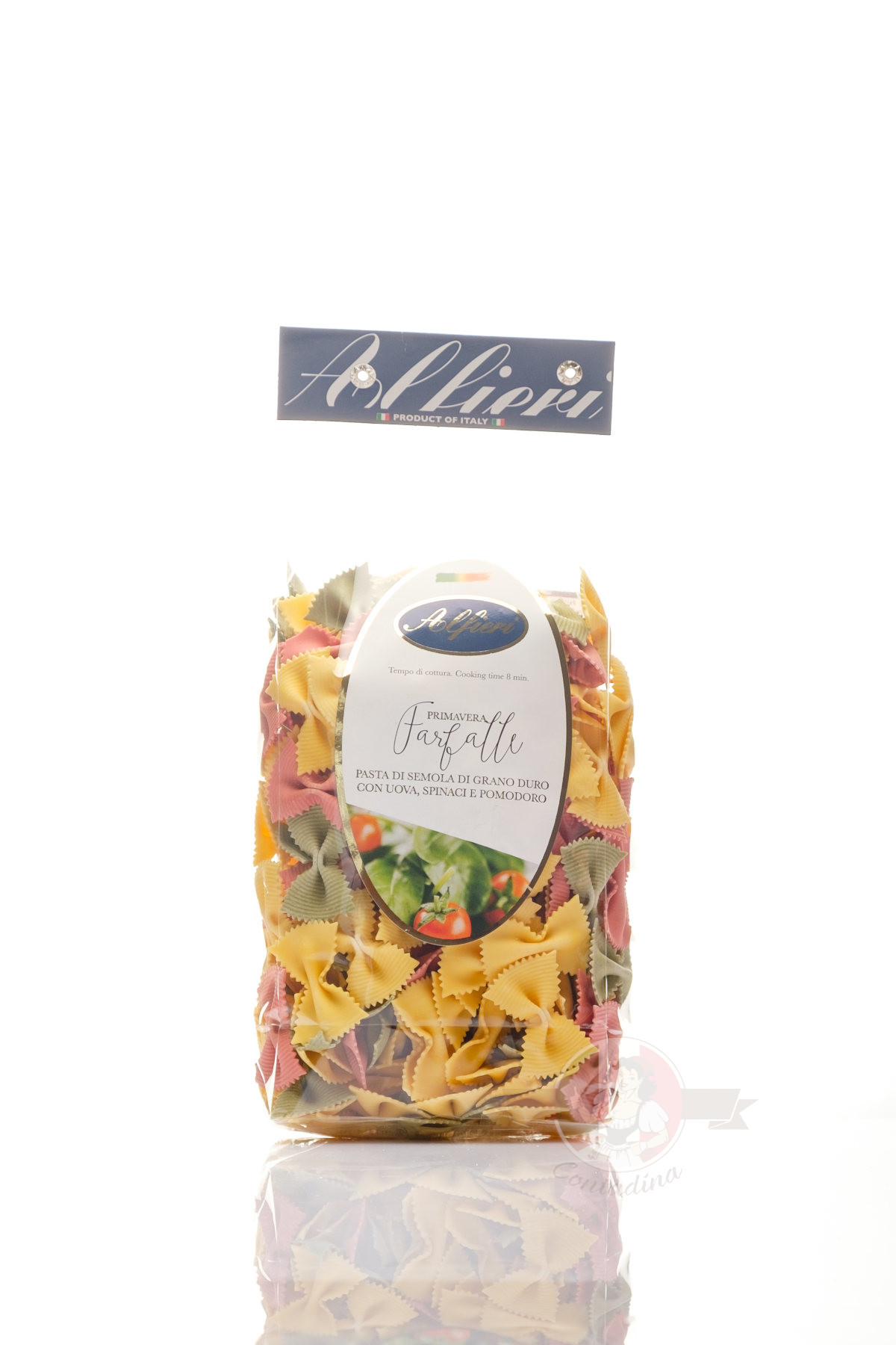 Kolorowy makaron Farfalle Primavera, w kształcie delikatnych kokardek, to połączenie tradycyjnej włoskiej receptury z naturalnymi barwnikami pochodzącymi z warzyw. Wytwarzany z najwyższej jakości semoliny z pszenicy durum, zachowuje idealną sprężystość i doskonale wchłania sosy. Żywe kolory i wyjątkowy kształt sprawiają, że każde danie staje się prawdziwą ucztą dla oka i podniebienia.