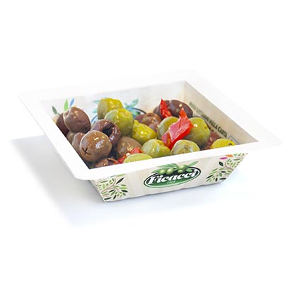 Oliwki Ficacci na papierowej tacy to świeże włoskie oliwki w ekologicznej, papierowej tacy PaperTray® — dostępne w dwóch wariantach: sycylijskie oraz mix sycylijskie i Kalamata z przyprawami i papryczką. Idealne jako przekąska, dodatek do antipasti, sałatek i desek serów. Ekologiczne opakowanie podkreśla śródziemnomorski styl i dbałość o środowisko.