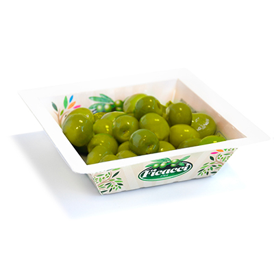 Oliwki Ficacci na papierowej tacy to świeże włoskie oliwki w ekologicznej, papierowej tacy PaperTray® — dostępne w dwóch wariantach: sycylijskie oraz mix sycylijskie i Kalamata z przyprawami i papryczką. Idealne jako przekąska, dodatek do antipasti, sałatek i desek serów. Ekologiczne opakowanie podkreśla śródziemnomorski styl i dbałość o środowisko.