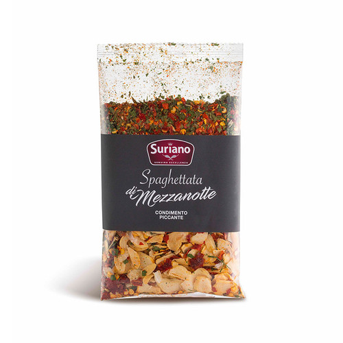 Spaghettata di Mezzanotte od Suriano to aromatyczna mieszanka przypraw włoskich, idealna do przygotowania szybkiego, wyrazistego w smaku spaghetti i innych dań makaronowych. Intensywne aromaty ziół i przypraw inspirowane kuchnią śródziemnomorską z Włochy pozwalają łatwo odtworzyć autentyczny smak włoskiej kolacji o północy.